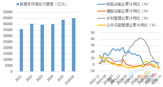 基建方面,我們判斷2026年投資將回正,基建端水泥需求將有改善。“十五五”規(guī)劃建議指出,加強(qiáng)謀劃論證,實(shí)施一批重大標(biāo)志性工程項(xiàng)目,高質(zhì)量推進(jìn)國(guó)家重大戰(zhàn)略實(shí)施和重點(diǎn)領(lǐng)域安全能力項(xiàng)目建設(shè)。2026年作為“十五五”開(kāi)局之年,預(yù)計(jì)專項(xiàng)債、超長(zhǎng)期特別國(guó)債發(fā)行規(guī)模將出現(xiàn)提高,基建投資將出現(xiàn)回正,但在化債政策影響下,水泥需求關(guān)系密切的交通類和市政基建投資或?qū)⒀永m(xù)低迷態(tài)勢(shì),預(yù)計(jì)基建整體對(duì)水泥需求支撐將有所改善,但力度可能仍然不強(qiáng)。