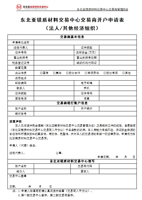 第五條 申請交易中心交易商,須填寫《交易商開戶申請表》,并按交易中心要求提供相關文件。